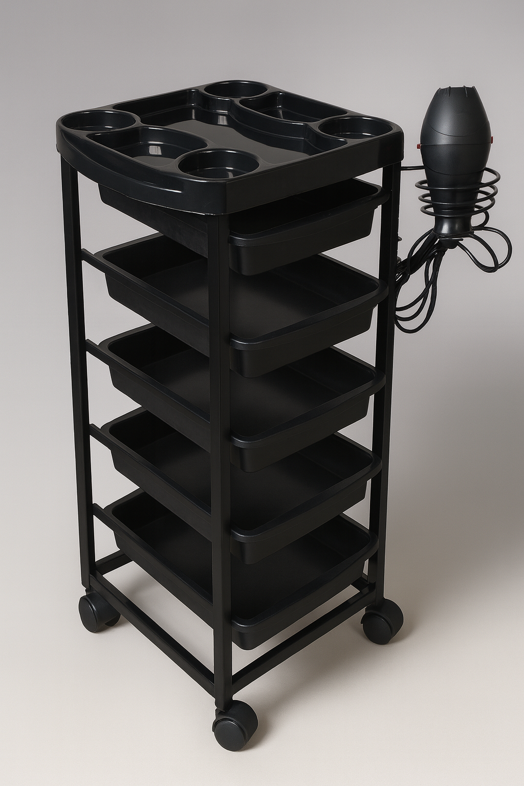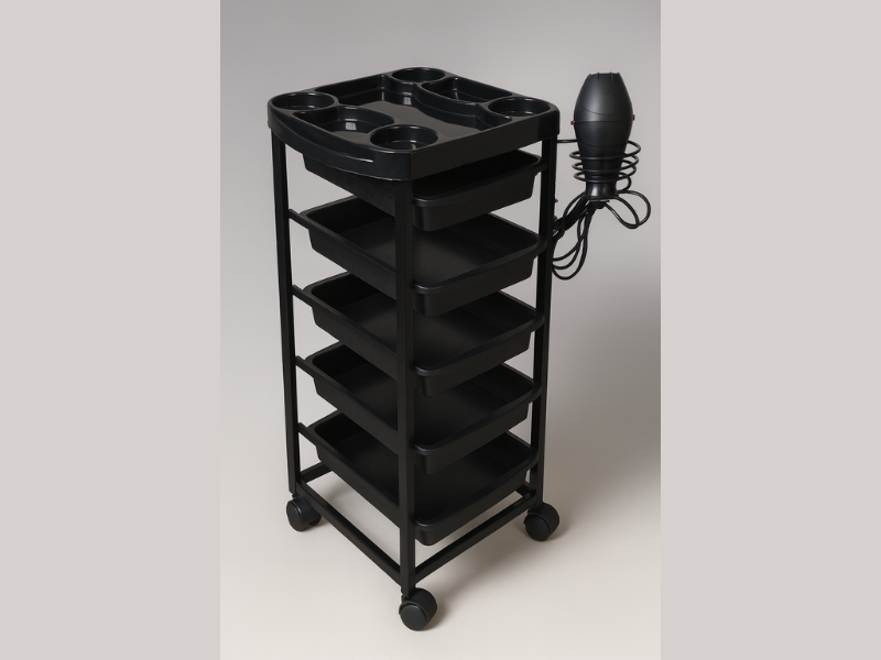 Estetik tasarımıyla dikkat çeken Enzo-2, modern kuaför salonlarının dekoruna uyum sağlar. Mat siyah rengi, hem şık hem profesyonel bir görünüm kazandırır. Raf aralıkları geniş tutulduğu için büyük şampuan şişeleri ve boya kutuları da kolaylıkla sığar.