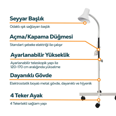 - Ayaklı muayene lambası: Taşınabilir yapısı sayesinde farklı odalarda kolayca kullanılabilir.