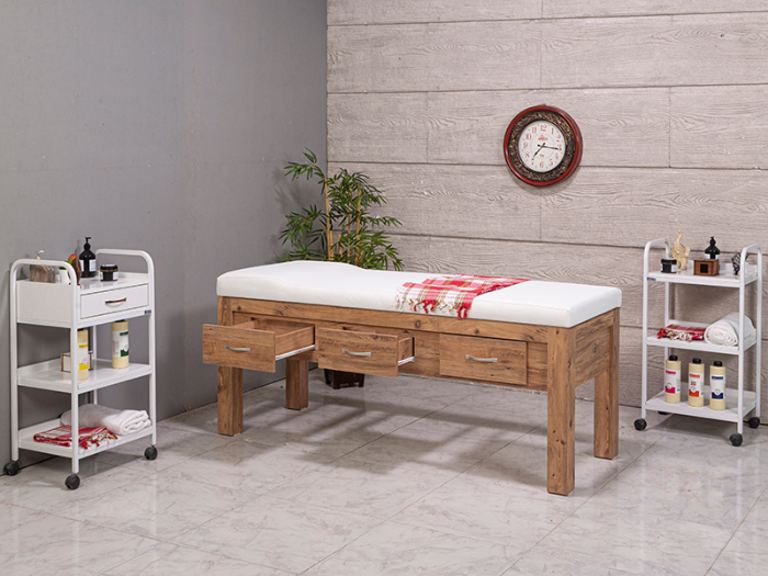 Spa odalarında ahşap gövdeli, geniş yüzeyli ve yüksek taşıma kapasiteli ahşap muayene masası formundaki sedyeler, hem atmosferi güçlendirir hem de uzun uygulamalarda konfor sağlar.