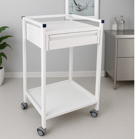 Evet. Üst tezgâh yüzeyi düz ve kolay silinir yapıda olduğu için geçici tezgâh rolünü üstlenebilir. Hasta başında pansuman hazırlığı, enjektör ve set düzeni, antiseptiklerin hazır bulundurulması gibi işlerde güvenle kullanılabilir. Uygulama anında frenleri kilitlemek, çalışma esnasındaki stabiliteyi garanti eder ve yüzeyde kaymaları önler.