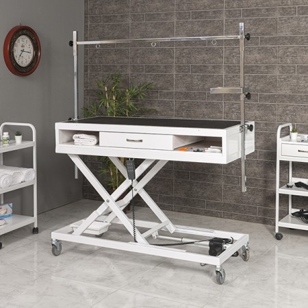 Elektrikli yükseklik ayarıyla geniş depolamayı bir araya getiren bu model, uzun süreli kullanımda verimliliği artırır ve düzenli bir çalışma alanı sağlar. Pet kuaför malzemeleri setine güçlü bir merkez oluşturmak isteyen salonlar için premium seçenektir.