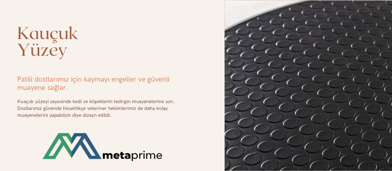 MetaPrime üretimi masalarda olduğu gibi, kaliteli veteriner muayene masası modelleri genellikle MDF alt taban üzerine döşenmiş, kaymaz özellikli kauçuk yüzey ile gelir. Bu yapı: