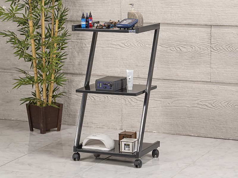 Z tipi tasarım, gövde yapısı sayesinde ağırlığı dengeli şekilde dağıtır ve raflara yerleştirilen malzemelerin stabil durmasını sağlar. Bu da stüdyo içinde düzenli bir çalışma alanı oluşturur. Üç rafın ayrı malzeme gruplarını taşıması ise seans içinde ekipmana ulaşımı hızlandırır. Mobil yapı sayesinde masayı farklı istasyonlara taşımak son derece kolaydır.